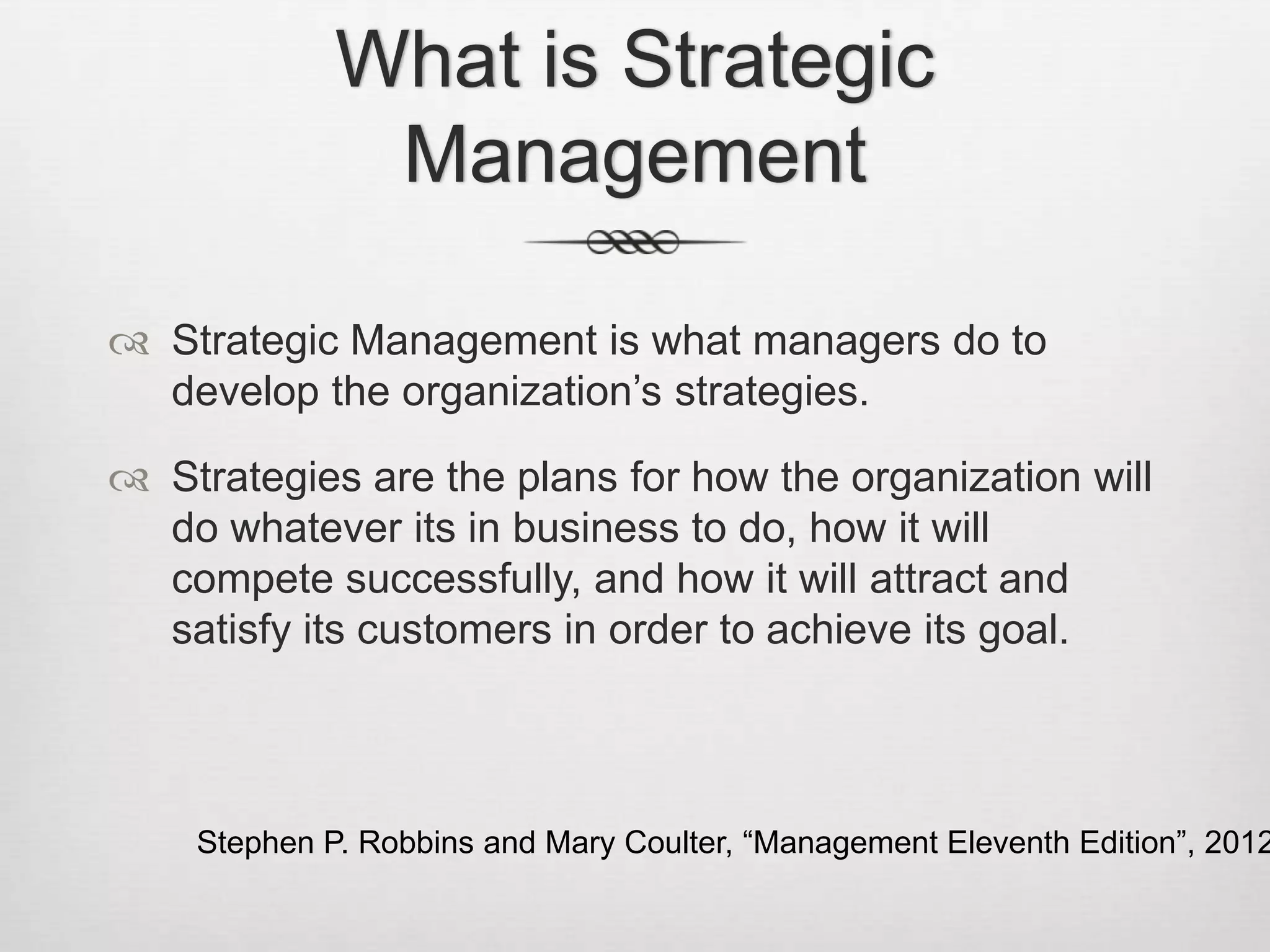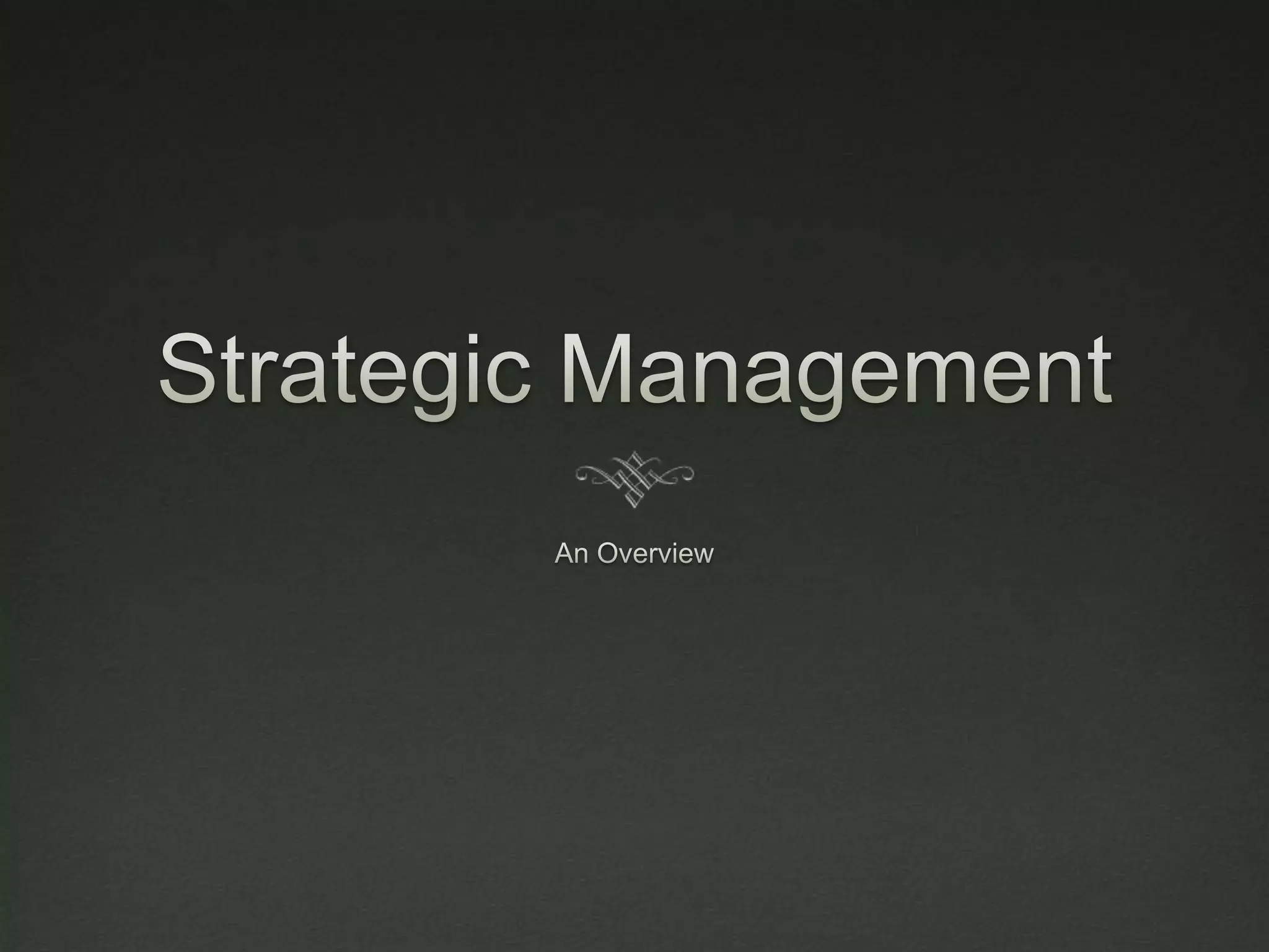 This document discusses strategic management and various related concepts. It defines strategic management as what managers do to develop organizational strategies. It then discusses why strategic management is important, outlining the strategic management process. It also summarizes various strategy types including corporate strategies, competitive strategies, and important strategies for today's environment.