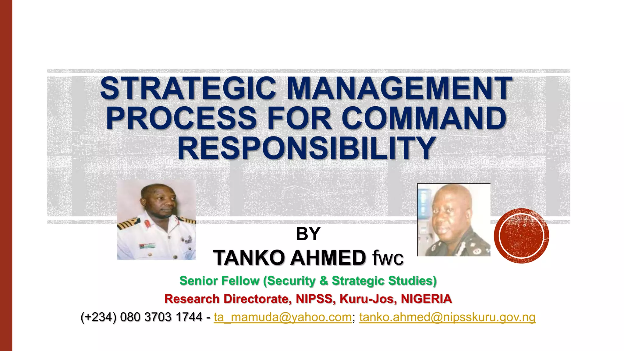 The paper discusses the strategic management process (SMP) as a vital tool for achieving command responsibility in military and organizational contexts, emphasizing the need for effective planning, implementation, and evaluation. It highlights the significance of strong leadership, willpower, and feedback systems in executing SMP to meet goals and objectives. The document also proposes that commanding officers should undergo training to enhance their ability to navigate the complexities of strategic management.
