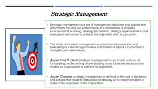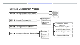 Strategic management involves analyzing the external environment, assessing internal strengths and weaknesses, formulating strategies, implementing strategies, and evaluating performance. It is a continuous process that helps organizations achieve long-term objectives. The key steps in strategic management are setting strategic intent through vision, mission, and objectives, formulating strategies through environmental and organizational analysis, implementing strategies through organizational structure and processes, and evaluating strategies and controlling performance.