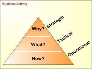 There are multiple levels of strategy needed for companies. Corporate strategy covers objectives and coordination across business units (SBUs). SBU strategies provide objectives and coordination for each business unit to contribute to corporate goals. Functional strategies deal with objectives and coordination within specific functions like marketing, sales, and distribution to support SBUs and corporate strategy. Strategists at different levels are involved in strategic management, including the board of directors, CEO, senior management, SBU executives, corporate planning staff, consultants, and entrepreneurs.
