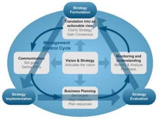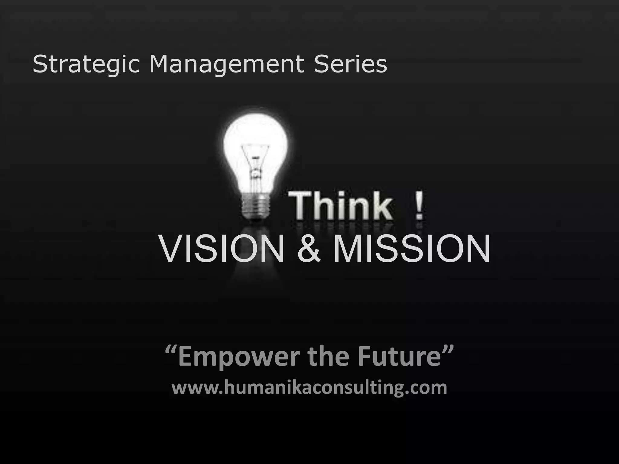 This document discusses strategic management, vision, mission, and why they are important for organizations. It defines strategic management as dealing with organizational renewal, growth, and developing strategies and systems to achieve this. A vision articulates an organization's future aspirations and inspires employees. A mission defines an organization's purpose and reason for existing. Good visions and missions should be inspiring, competitive, represent integrity, and motivate employees to help the organization achieve its goals.