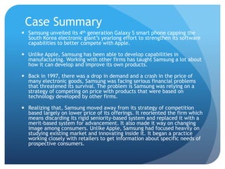 This document contains a case study summary for a class on strategic management. It discusses Samsung's history and strategy, including how it moved from competing on price to developing its own capabilities in manufacturing and software. It struggled financially in 1997 when relying only on lower-priced products using others' technology. Samsung reoriented its strategy by focusing on innovation, working closely with retailers, and changing to a merit-based advancement system. The document also provides an overview of Samsung's vision, mission, business highlights, products, marketing strategies, and recommendations for developing products to meet needs in parts of Africa.