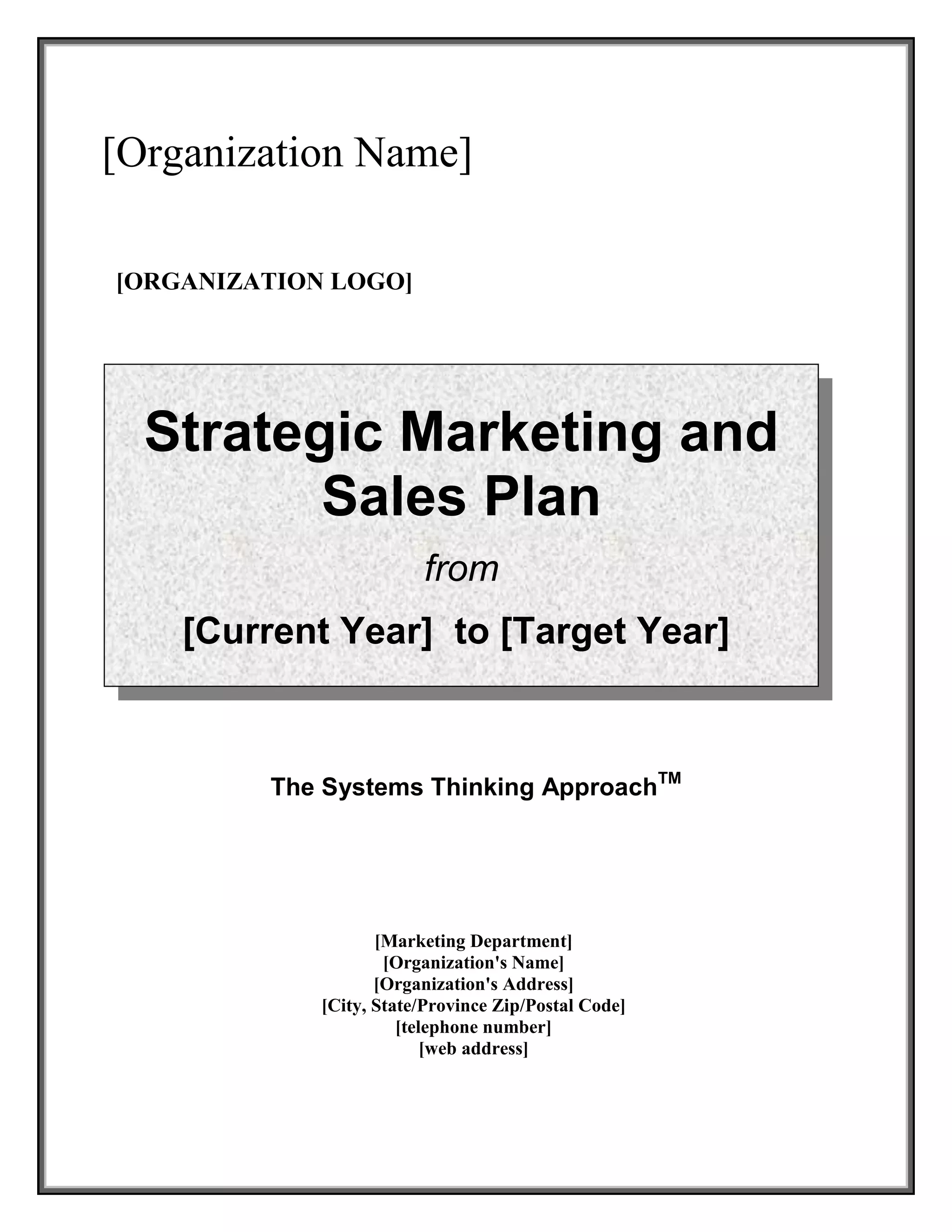 This document contains a strategic marketing and sales plan for an organization from [Current Year] to [Target Year]. It includes an introduction, environmental scan, vision, mission, values, key success measures, current state assessment, strategies, and implementation plan. The core strategies identified are to [1-2 bullet points of core strategies]. The plan aims to move the marketing and sales department from its current state to its envisioned future state over the period outlined.