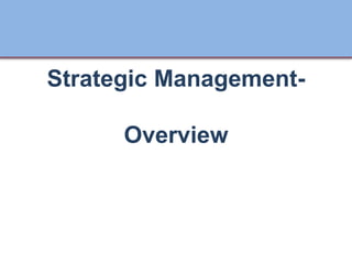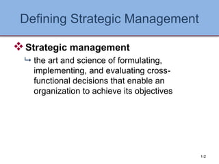 Strategic management is defined as the art and science of formulating, implementing, and evaluating cross-functional decisions to help an organization achieve its objectives. The strategic management process consists of three main stages: strategy formulation, implementation, and evaluation, focusing on setting missions, analyzing situations, and adjusting strategies as needed. Effective strategic management leads to improved performance and communication within enterprises, while avoiding common pitfalls such as inadequate involvement from key personnel and hasty decisions.