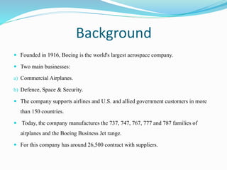 Boeing founded in 1916 is the world's largest aerospace company with two main businesses of commercial airplanes and defense. In the late 1990s/early 2000s, Boeing merged with competitors and unveiled a new vision. It announced the 787 Dreamliner in 2003 to compete with Airbus' A380 superjumbo, which saw delays until first delivery in 2011 due to issues with suppliers and new composite materials. Boeing responded by promoting collaboration with partners and developing new monitoring tools to better integrate production globally.