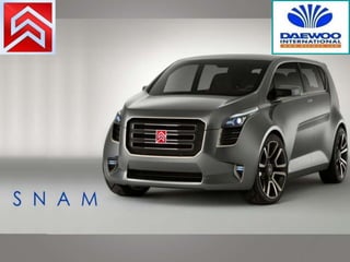 This document outlines the strategic technology partner's areas of focus in automotive products and technologies, including integrated chassis systems, next generation powertrains, safety and driving assistance systems, infotainment and telematics, electric and electronic systems, and aftermarket equipment. It also mentions that the strategic partner provides vehicle development and industrialization services, such as for the SNAM project in KSA.