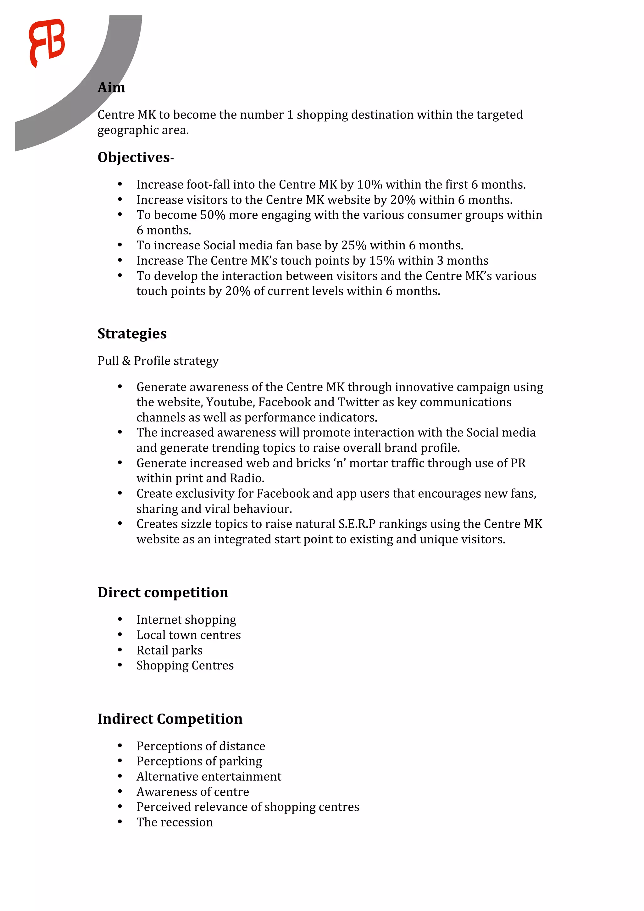 The document outlines a marketing strategy for Centre MK to become the number one shopping destination in its target area. It details objectives to increase foot traffic, website visits, social media followers, and brand engagement. It profiles key customer personas and identifies a big idea of creating a reality internet show focused on the shopping centre to portray a lifestyle of fashion and socializing. The strategy aims to achieve its objectives through an integrated digital campaign centered around the reality show content.