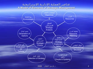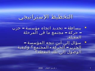 الوثيقة تناقش أهمية التخطيط الاستراتيجي للأحزاب والمؤسسات، حيث يتناول مجموعة من العناصر الأساسية لنجاح هذا التخطيط مثل التحليل الاستراتيجي واختيار الاستراتيجيات المناسبة. كما تشير إلى التحديات التي قد تواجه المؤسسات في تنفيذ التغييرات الاستراتيجية والضغوطات المختلفة التي تعيق التغيير. يتم التأكيد أيضًا على أهمية مشاركة جميع المعنيين في عملية التخطيط لتحقيق أهداف المؤسسة الفعالة.