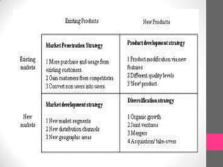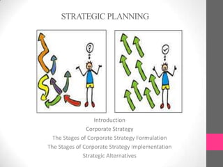 The document discusses various concepts related to strategic planning and corporate strategy formulation. It begins with defining strategy and the importance of strategic planning. It then covers the following key points: