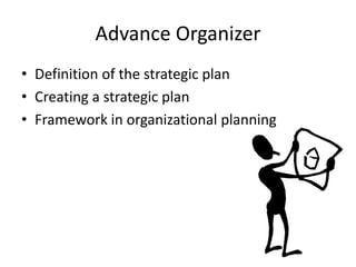 The document discusses the process of strategic planning for schools. It begins by defining strategic planning and its importance. There are then 7 steps outlined: 1) gathering internal and external information, 2) identifying critical issues, 3) developing a vision statement, 4) reviewing the mission statement, 5) establishing goals, 6) formulating strategies, and 7) setting annual objectives. The purpose is to help schools determine their priorities and allocate resources effectively to achieve desired results over the next few years.