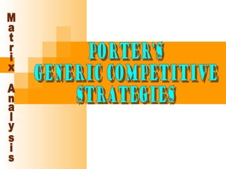 The document discusses several analytical methods used for strategic analysis including SWOT analysis, critical success factors analysis, matrix analysis, value chain analysis, and Porter's five forces analysis. It provides details on how to conduct a SWOT analysis, including examining a company's internal strengths and weaknesses as well as external opportunities and threats. It also outlines the key components of Porter's five forces model which examines the competitive environment including threats from new entrants, power of suppliers and buyers, and rivalry among existing competitors.