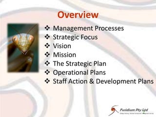 This document discusses strategic planning and provides guidance on developing an effective strategic plan. It explains that a strategic plan should be outward looking, based on solid market research, and have buy-in from all staff. The strategic planning process involves analyzing the industry, identifying stakeholders and strategic partners, and developing goals and key performance indicators. Operational plans then translate the strategic plan into specific actions and tasks. Individual employee goals are also linked to the operational plans. Regular review and reporting is important to ensure the plans remain on track and aligned with the organization's vision and mission.
