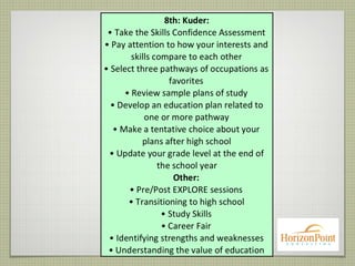 The document outlines Decatur City Schools' goal of achieving 100% college and career readiness for graduates through a supportive learning environment. It emphasizes the importance of setting clear, measurable objectives, such as utilizing Kuder for individual student learning plans. Additionally, it highlights the need for a marketing plan to promote the educational program.