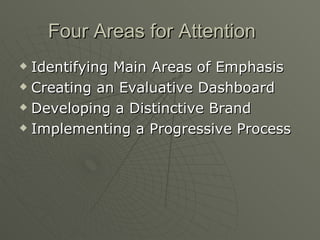 4) Implementing a progressive six-month planning process aligned with the emphasis, dashboard and brand to allow for regular evaluation and adaptation.