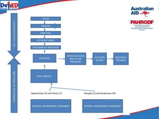The document provides an overview and agenda for a 5-day training on strategic planning for DepEd units, including developing a vision, mission, objectives and performance indicators, as well as conducting environmental assessments and formulating strategic plans and action programs. The training will utilize various frameworks and approaches to strategic planning, including rational and adaptive models, and cover topics such as developing a vision and mission statements, setting objectives and key result areas, and conducting SWOT and environmental analyses. The overall goal is to improve participants' knowledge and skills for strategic planning to help their respective DepEd units develop strategic plans.