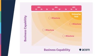 This document provides guidance on how to build a business capability map for strategic planning purposes. It explains that a business capability map creates a shared understanding of an organization's capabilities based on its priorities and architecture. The document then defines what a business capability is and how a map differs from a framework. It offers tips for defining capabilities, such as considering current and future states, ensuring capabilities are stable, and decomposing them cohesively. Finally, it discusses different approaches to building a map and provides steps for structuring and organizing the map, along with tenets for effective planning.