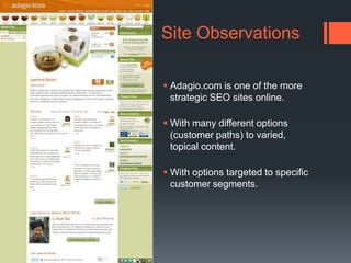 The document analyzes Adagio.com as a well-architected e-commerce and social community site with strong SEO strategies, showcasing its extensive, varied content targeted at specific customer segments. It emphasizes the challenges competitors face in directly competing against Adagio due to its dominance in broad keywords, suggesting that success lies in targeting underserved niches. It recommends employing digital audits and SEO tools to develop effective market strategies and foster a loyal customer base.
