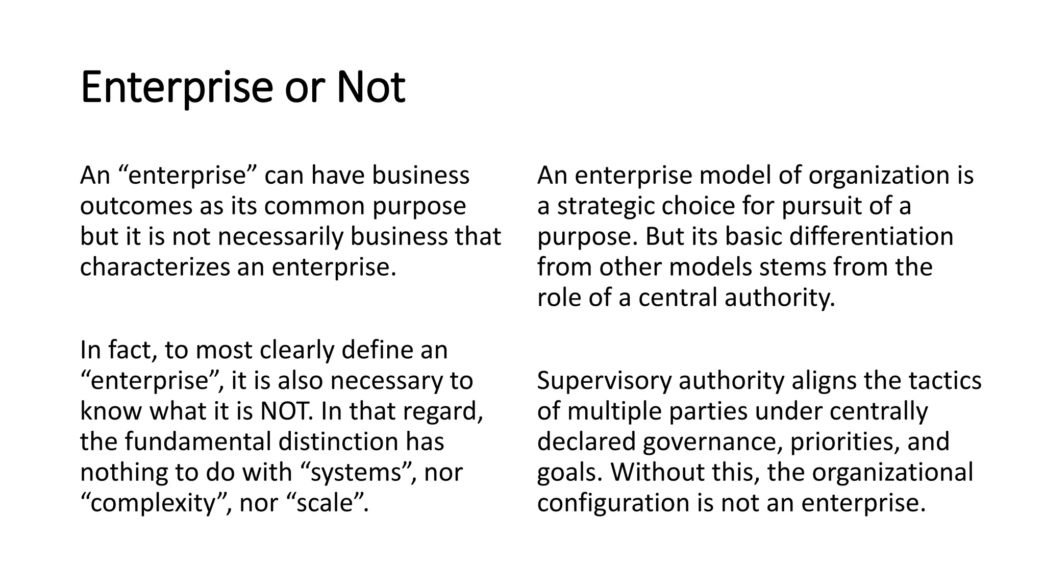 The document discusses the concept of an 'enterprise' as a structural model for aligning multiple organizations towards a common purpose under a central authority, emphasizing the importance of governance and strategic alignment. It contrasts enterprise models with other forms of cooperation, such as coalitions, federations, and consortia, each characterized by different objectives and commitments. The text also highlights the significance of accurately understanding these distinctions to avoid organizational mismatches.
