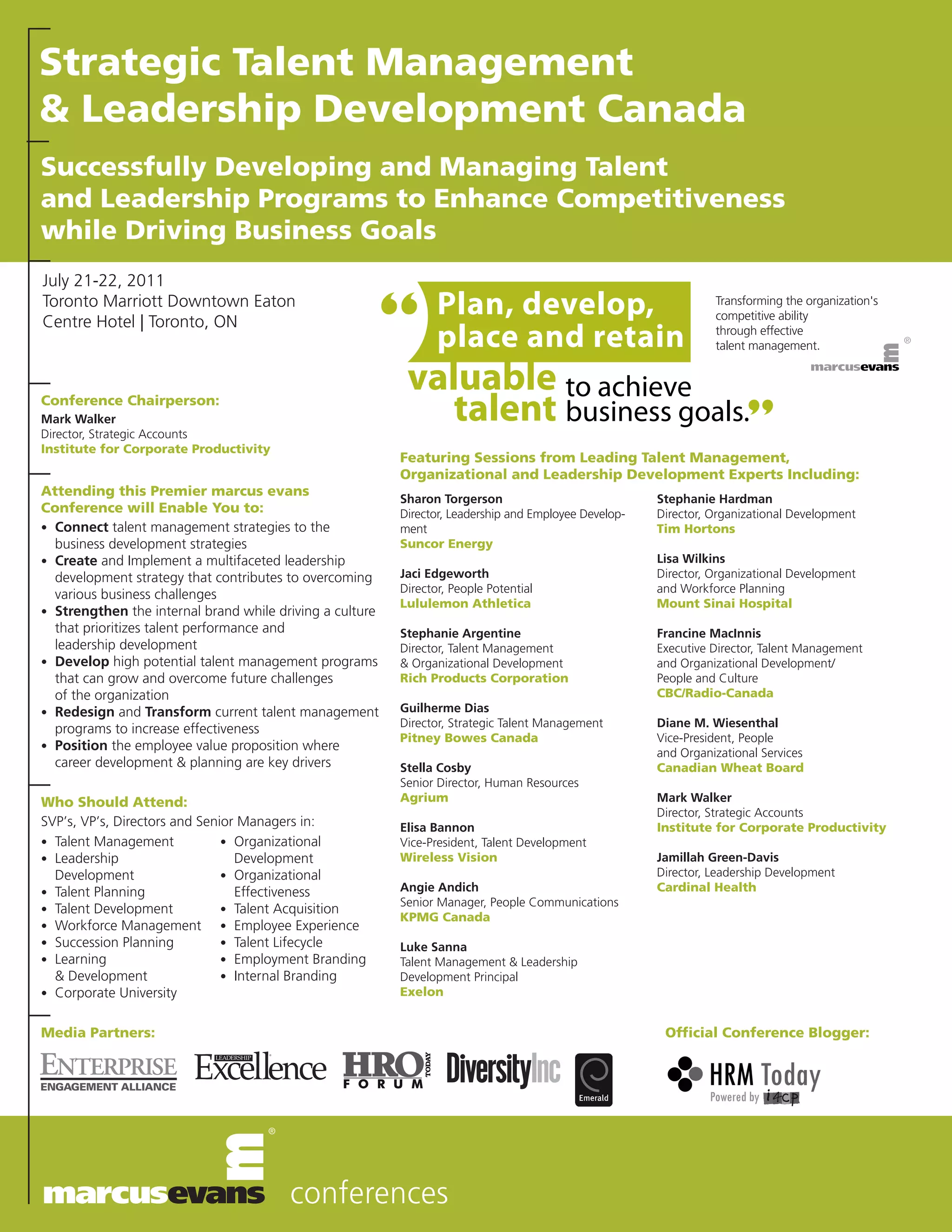 This document provides information about a conference on strategic talent management and leadership development. The two-day conference in Toronto will focus on successfully developing and managing talent and leadership programs to enhance business competitiveness and goals. It will enable attendees to connect talent strategies to business strategies, create multifaceted leadership development strategies, and strengthen internal talent management programs. The agenda includes keynote speakers and case studies from top companies on various talent management topics.