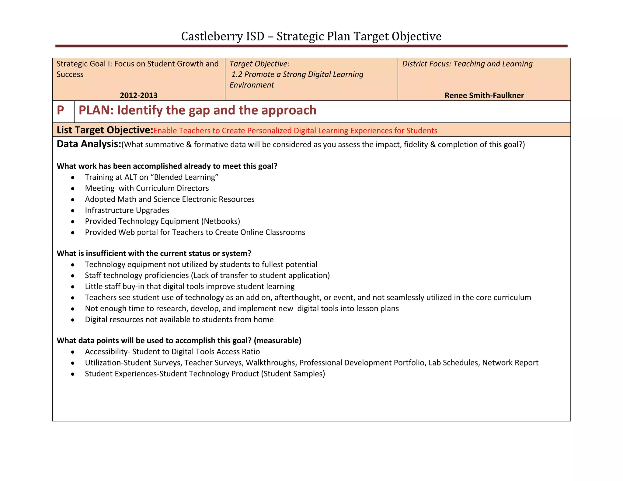 The strategic plan target objective aims to promote a strong digital learning environment by enabling teachers to create personalized digital learning experiences for students. The plan identifies gaps such as insufficient technology utilization and proposes strategies to improve accessibility, utilization, and personalized learning experiences through measures like increasing device access, walkthroughs, and teacher training. Progress will be monitored through data collection and analysis with the goal of meeting targets by the end of the year.