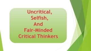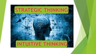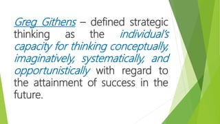 The document discusses strategic thinking and the mental processes involved. It defines strategic thinking as an individual's ability to think conceptually, imaginatively, systematically, and opportunistically to achieve future success. The key mental processes in strategic thinking are conceptual thinking using analogy, systematic thinking involving pattern finding and connecting unrelated situations, imaginative and creative thinking, and opportunistic thinking that searches for new information and value. The strategic thinker applies these cognitive processes oriented toward future success.
