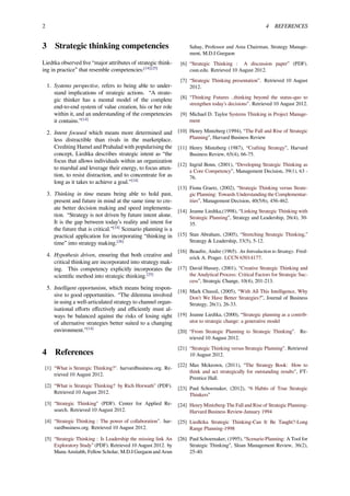 Strategic thinking involves generating business insights and opportunities to create a competitive advantage. It can be done individually or collaboratively, and involves considering different perspectives on critical issues. Strategic thinking is defined as a cognitive process that produces thought for achieving success, whereas strategic planning is a separate but related process that realizes strategies through integration back into the business. Key attributes of strategic thinkers include having a systems perspective, being intent-focused, thinking in time about past, present and future, being hypothesis-driven, and demonstrating intelligent opportunism.