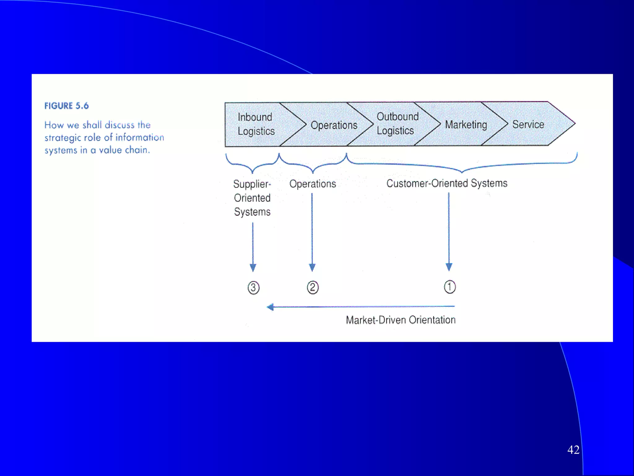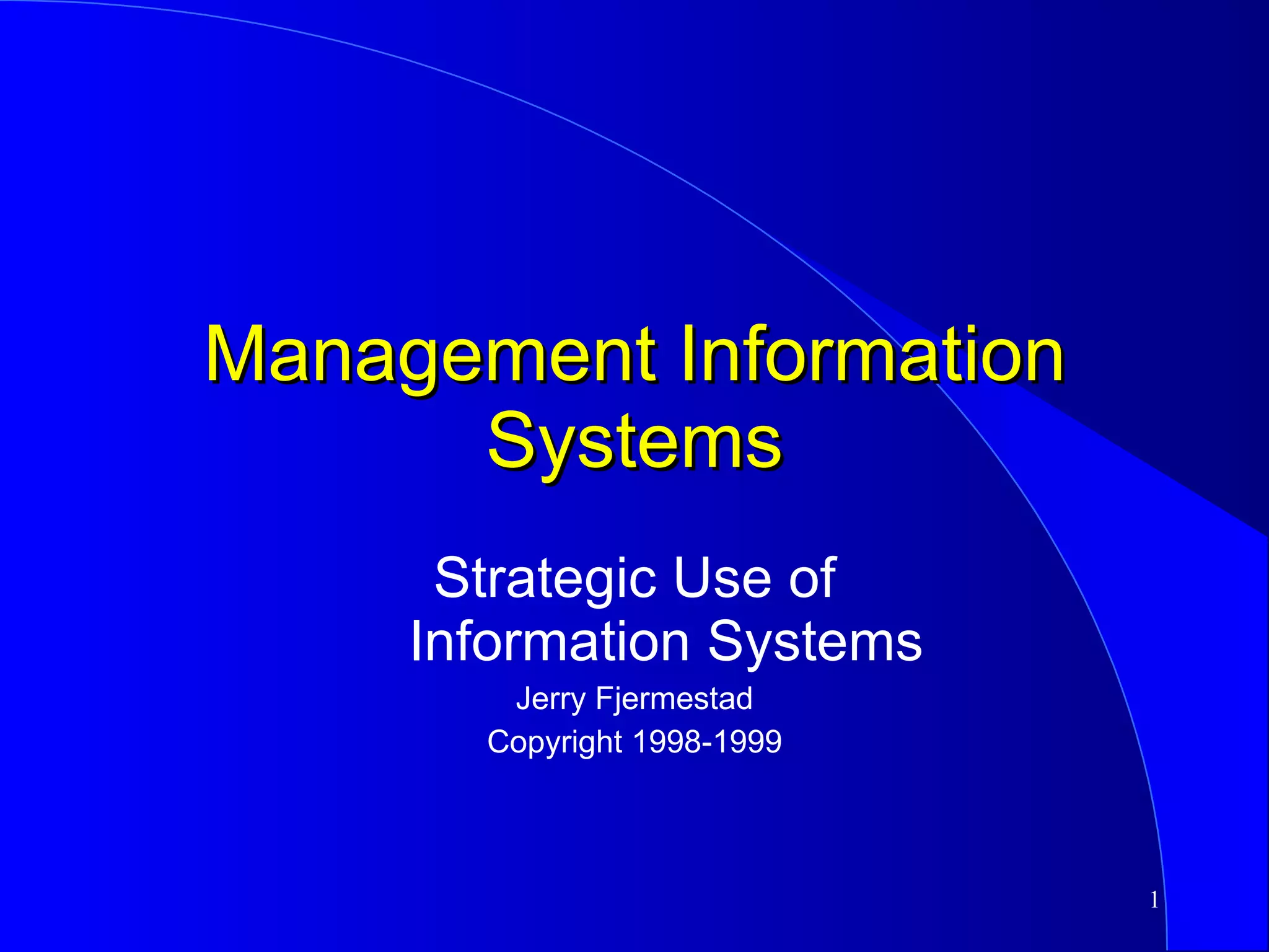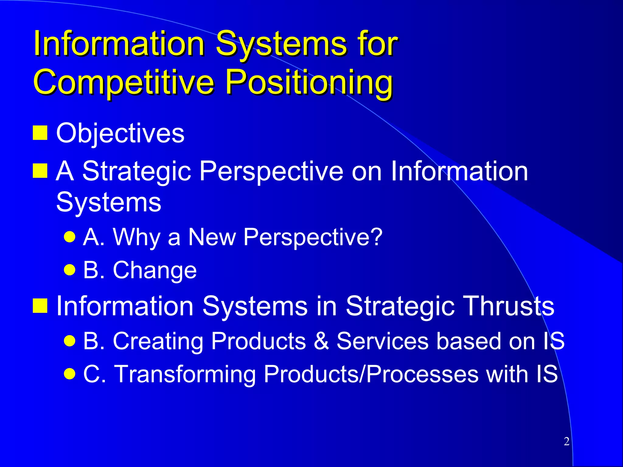 This document discusses strategic uses of information systems. It begins by explaining the need for a strategic perspective on IS and how IS can help redefine a company's business model, create new products and services, or transform existing processes. It then covers strategies and tactics for competitive markets, including competitive systems, forces, and analyzing a company's value chain for strategic opportunities. Specific examples of customer-oriented and supplier-oriented strategic systems are provided.