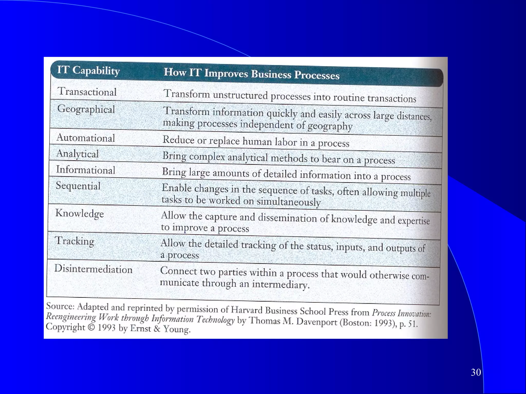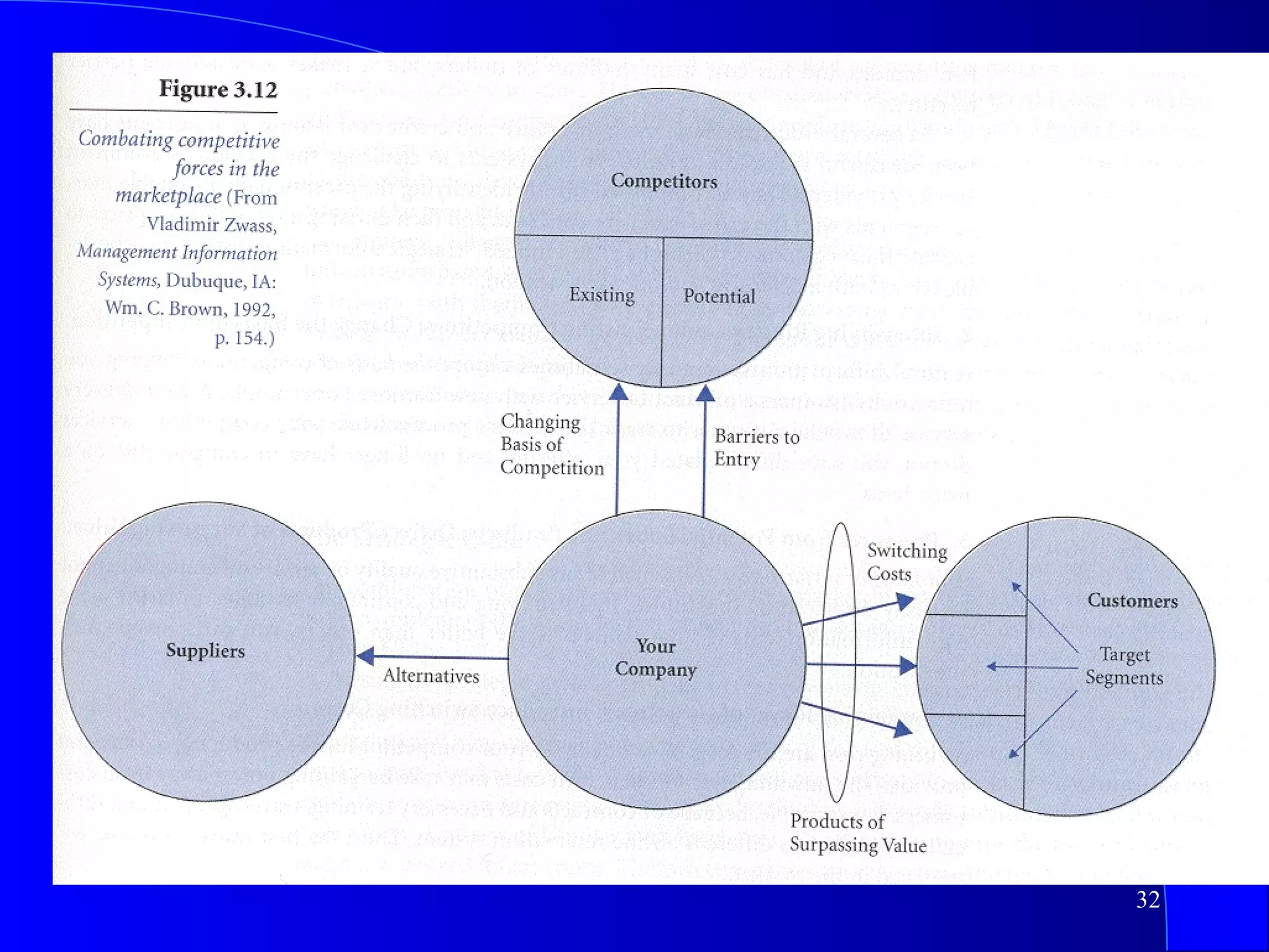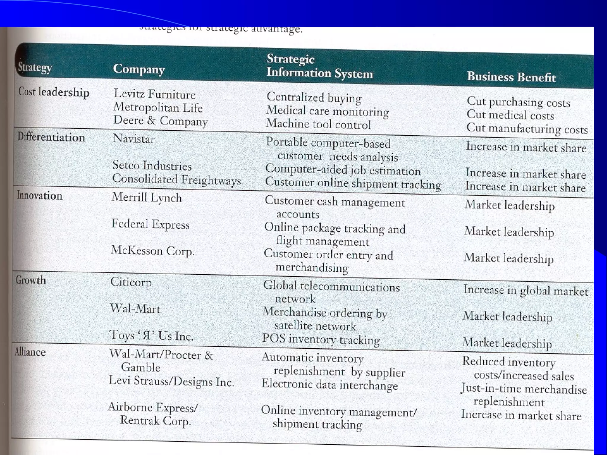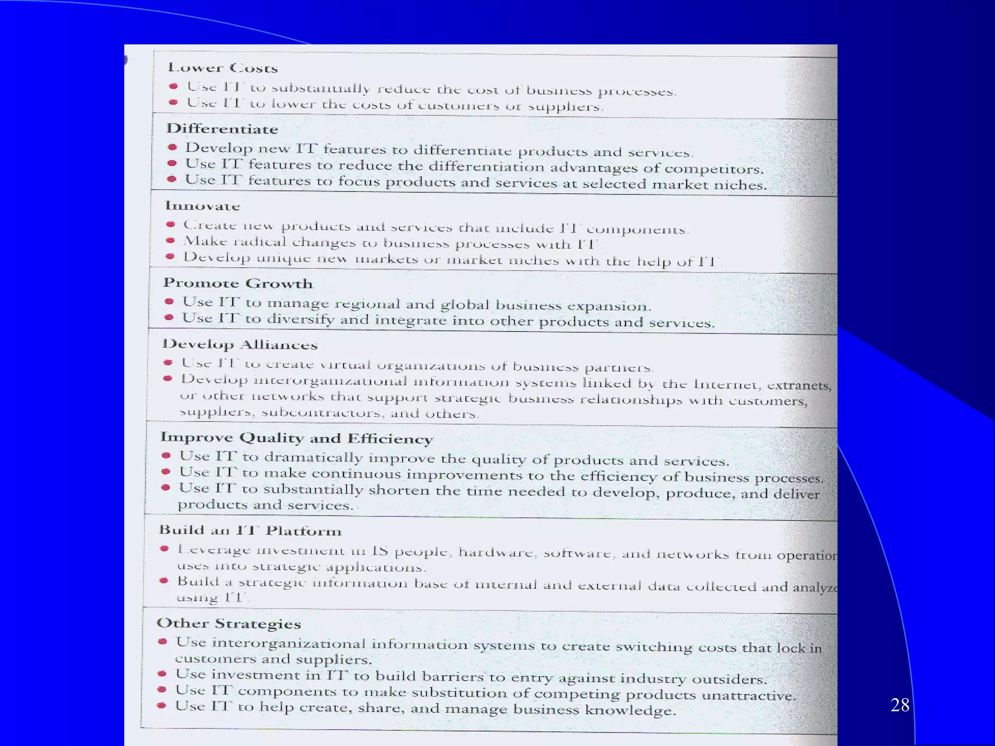 This document discusses strategic uses of information systems. It begins by explaining the need for a strategic perspective on IS and how IS can help redefine a company's business model, create new products and services, or transform existing processes. It then covers strategies and tactics for competitive markets, including competitive systems, forces, and analyzing a company's value chain for strategic opportunities. Specific examples of customer-oriented and supplier-oriented strategic systems are provided.
