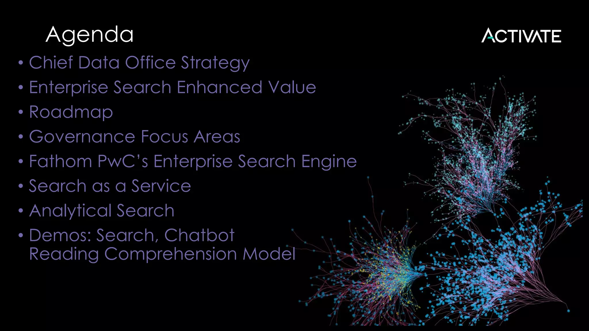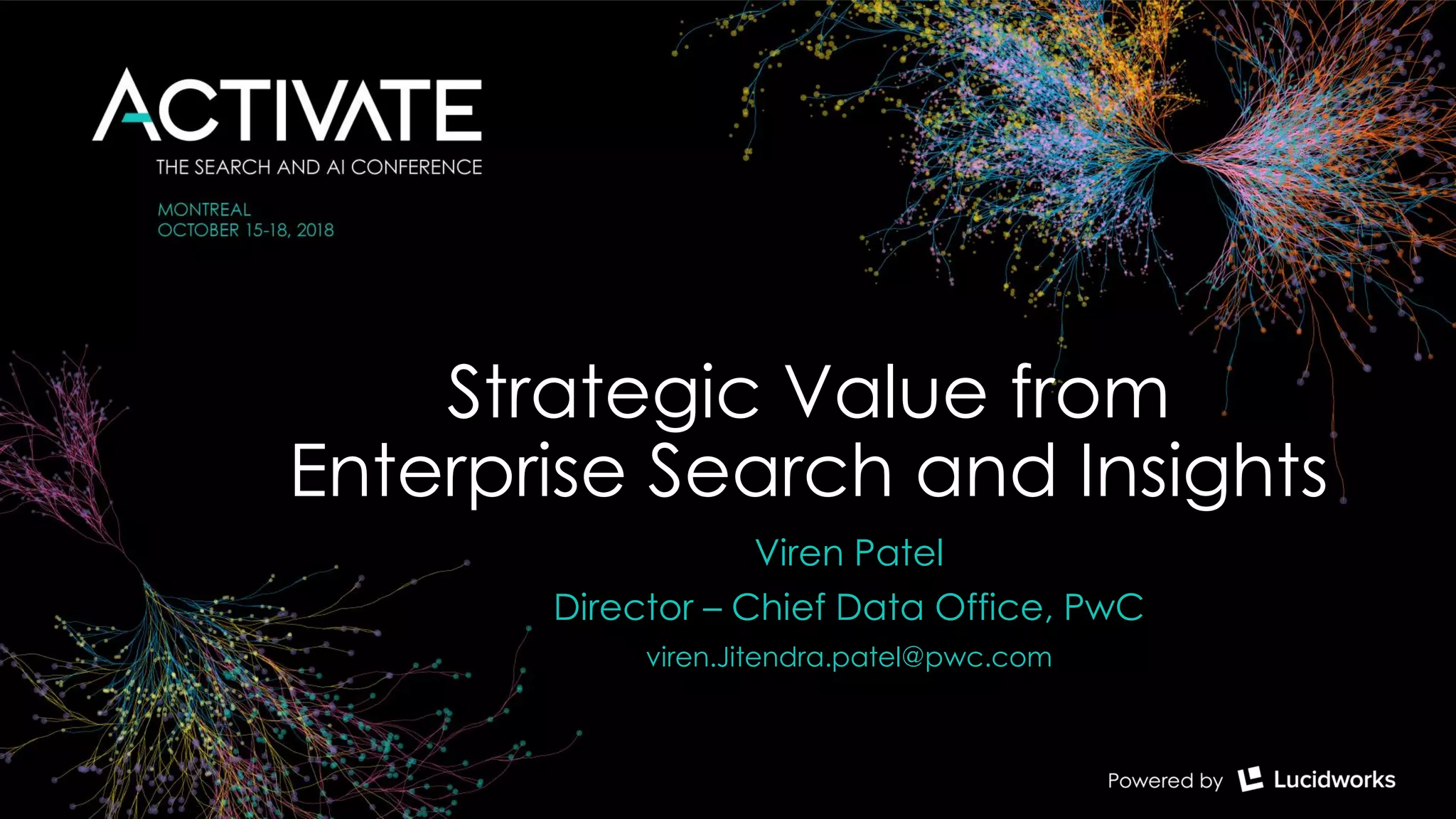Viren Patel discusses PwC's enterprise search strategy and capabilities. The Chief Data Office's goals are to leverage data as a strategic asset by reducing unnecessary data, indexing valuable data, creating master data sources of truth, and exposing data to enable broader access. PwC's enterprise search engine Fathom provides value by allowing knowledge workers to easily find information, discover existing documents to reuse, and free up time with clients. Fathom uses analytics, machine learning and AI to power search and provide answers to questions. Governance focuses on metrics, processes, training and marketing to drive awareness and benefits of enterprise search. Demos of Fathom search, a chatbot and reading comprehension model are provided.