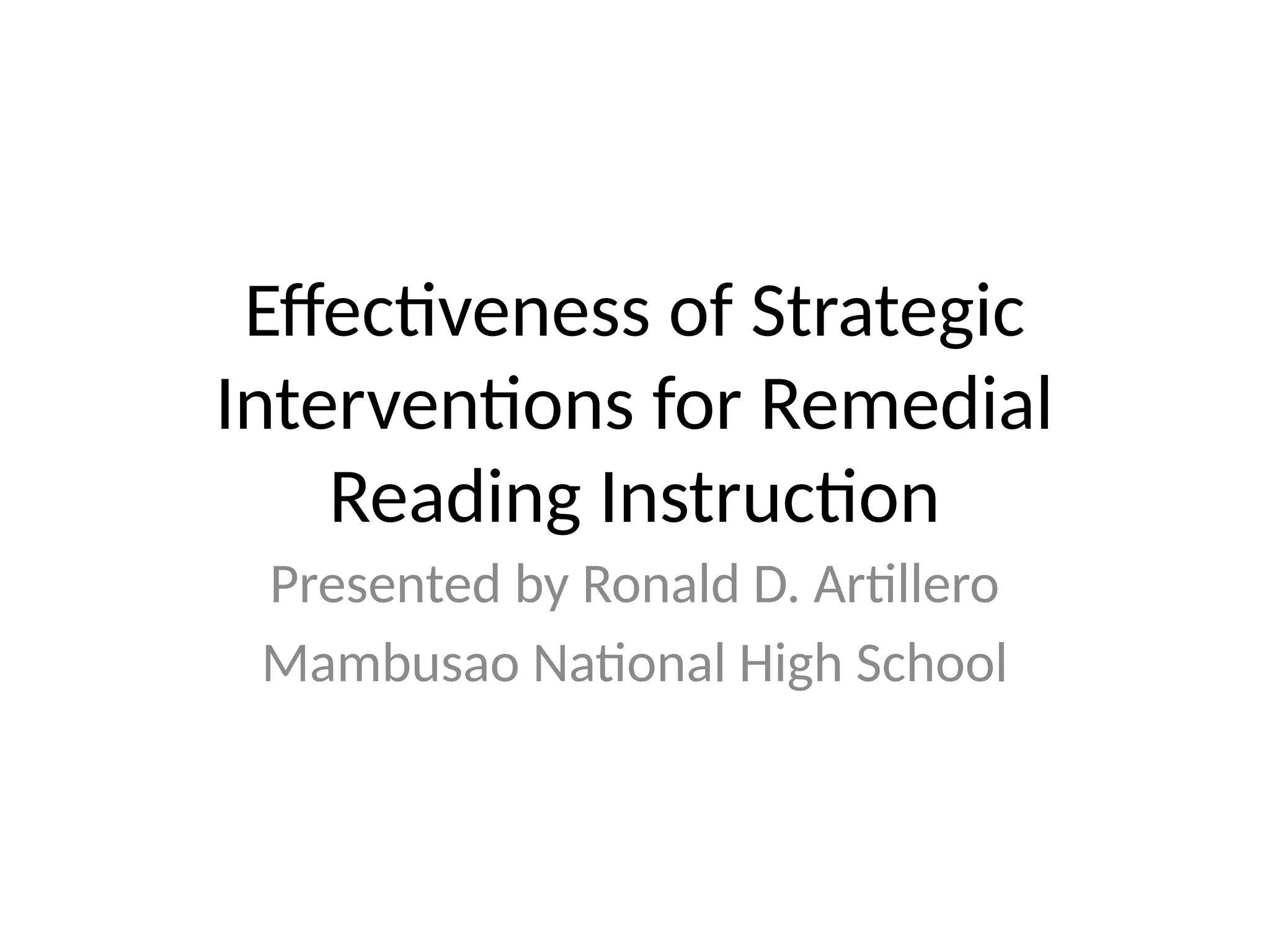 The study evaluates the effectiveness of strategic interventions on reading comprehension skills in grade 7 learners at Mambusao National High School. After a 5-week intervention, results showed a marked improvement in comprehension, with post-test scores rising from a mean of 3.50 to 14.00, indicating proficiency. The findings underscore the importance of tailored instructional strategies and addressing socio-economic disparities in education.