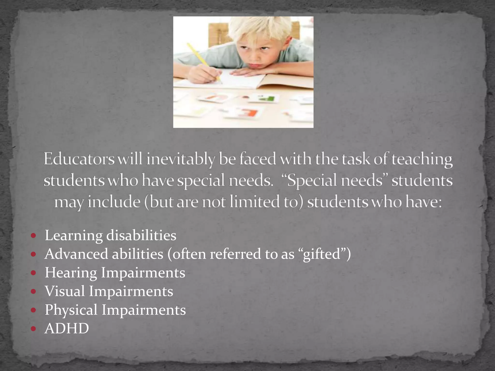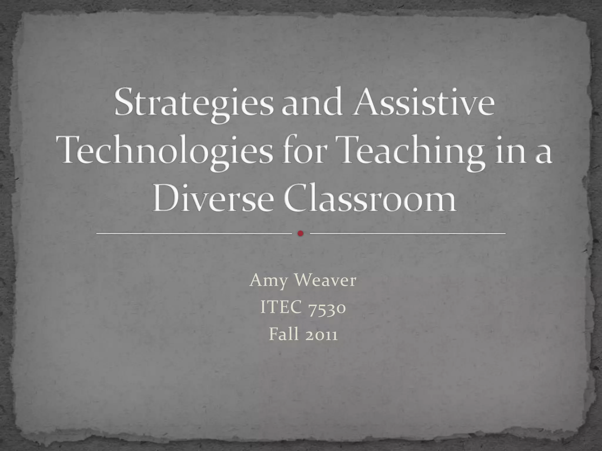 The document discusses strategies and assistive technologies for teaching diverse classrooms. It provides recommendations for teaching students with special needs, including those with learning disabilities, giftedness, hearing or visual impairments, physical disabilities, or ADHD. It also discusses individualized education programs and assistive technologies that can benefit students with various cognitive or physical disabilities. Key considerations for choosing assistive technologies include matching the technology to the individual student, the tasks to be performed, the environment where it will be used, and the device's specific features.