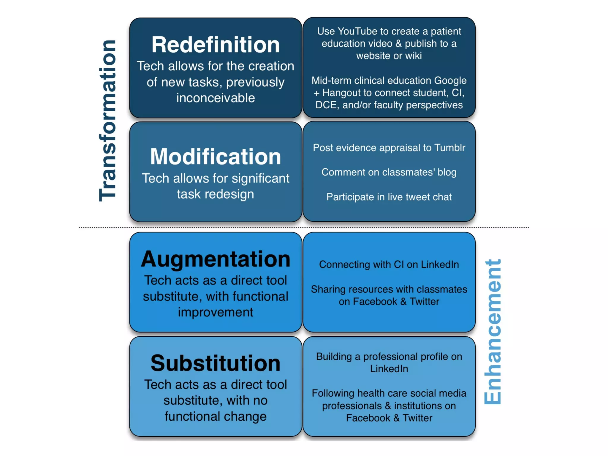 This document discusses various strategies for integrating instructional technology. It begins by distinguishing between using technology versus integrating it. Technology integration is planned and purposeful, supports learning objectives, and facilitates collaboration. The document then covers several models for conceptualizing levels of technology integration, including the SAMR model and the TPACK framework. It provides considerations for integrating technology based on content, students, instructors, institutions, and specific technologies. Overall, the document provides an overview of key strategies and frameworks for meaningfully integrating technology to support learning objectives.