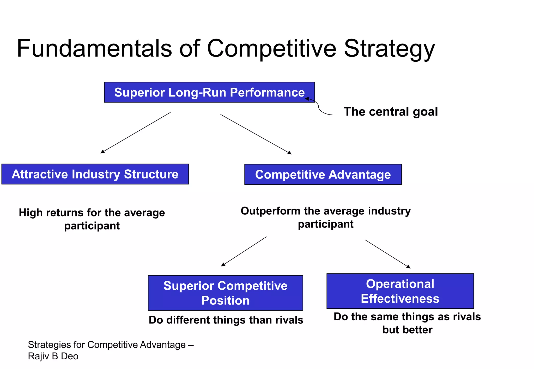 The document discusses strategies for achieving competitive advantage. It introduces Porter's value chain model which views a firm as a collection of primary and support activities that add value. The value chain can be used to identify processes that add or reduce value for customers. Developing strategies may involve planning better ways to meet customer demands, identifying value-adding processes, and looking beyond the firm's boundaries to its supply chain. Maintaining a competitive advantage requires being efficient, aware of competition, innovating technology, and recognizing that advantages are temporary.
