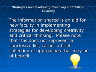 The document outlines strategies for developing creativity and critical thinking in students. It provides 5 strategies for creativity, such as not providing all information to students and requiring them to think, discover, and create. It also provides 5 strategies for critical thinking, including starting with lower-level questions to build confidence and requiring students to read questions carefully before answering. The strategies are intended to help new faculty spark creativity and critical thinking in their classrooms.