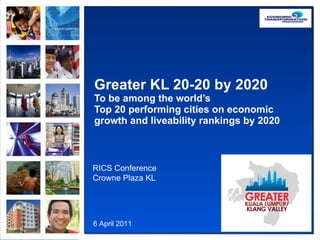 The document discusses strategies to develop Greater Kuala Lumpur/Klang Valley (GKL) and achieve the goal of being among the world's top 20 performing cities by 2020. It outlines 11 initiatives prioritized across 4 strategic thrusts - making GKL a magnet, connecting places in GKL, developing new places, and enhancing services. Key initiatives include attracting 100 top multinational corporations, developing high-speed rail and mass rapid transit connections, rejuvenating rivers and green spaces, and improving basic infrastructure. The initiatives are estimated to contribute approximately RM190 billion in additional gross national income to GKL by 2020.