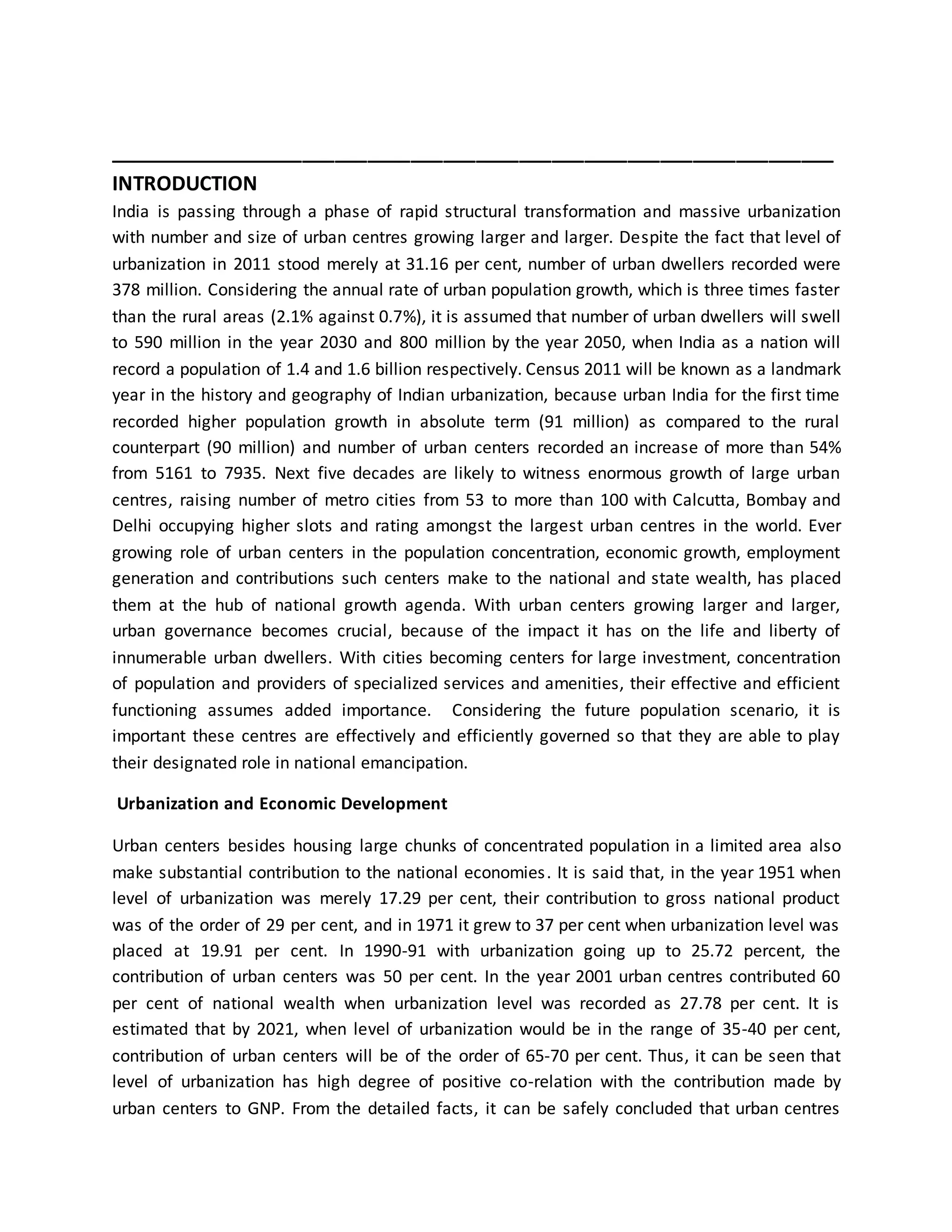 The document discusses the rapid urbanization in India and its significant impact on economic growth, while highlighting the challenges of inadequate urban governance and poor service delivery in Indian cities. Despite recent initiatives aimed at improving urban infrastructure and livability, local governments remain constrained by excessive state control and insufficient resources. The paper calls for reforms in urban governance to empower local bodies and enhance their capacity to meet the needs of urban populations effectively.