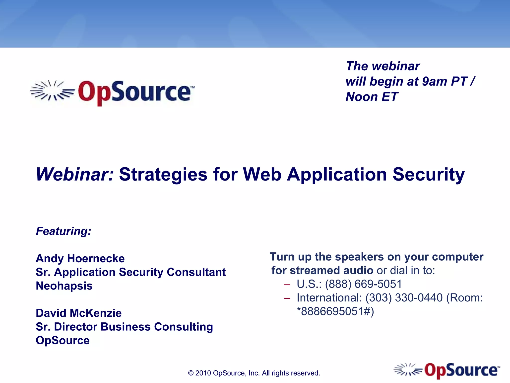 The webinar on web application security strategies will begin at 9am PT / Noon ET. It will feature Andy Hoernecke from Neohapsis who will present on web application scanning strengths, weaknesses, and how scanning fits into the secure development lifecycle. The webinar will include an introduction, presentation, and question and answer session.