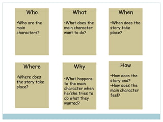This document provides strategies for adding descriptive details and flair to writing stories. It recommends introducing background knowledge on the subject or genre before having students answer basic questions about the who, what, when, where, and why of the story structure. Students then go back and add sensory and structural details to their writing by using their five senses and words describing what, size, color, number, shape, where, when, background, movement, mood, and perspective.