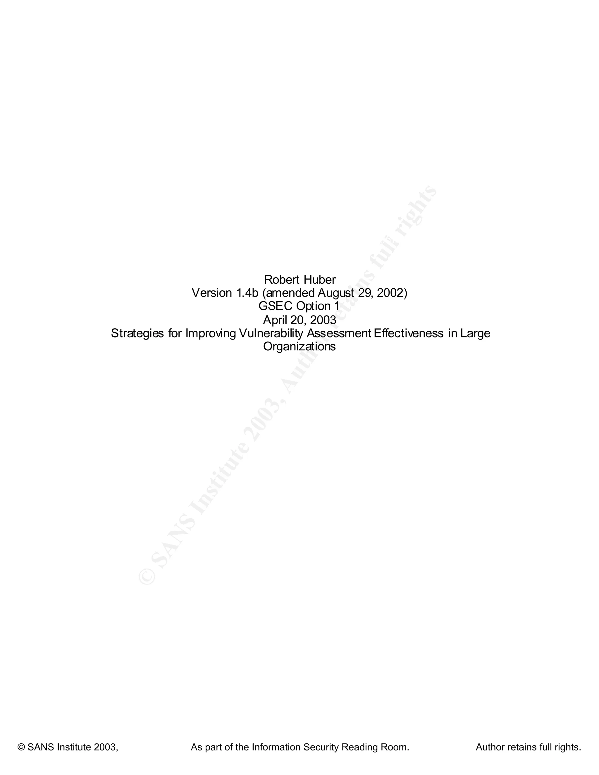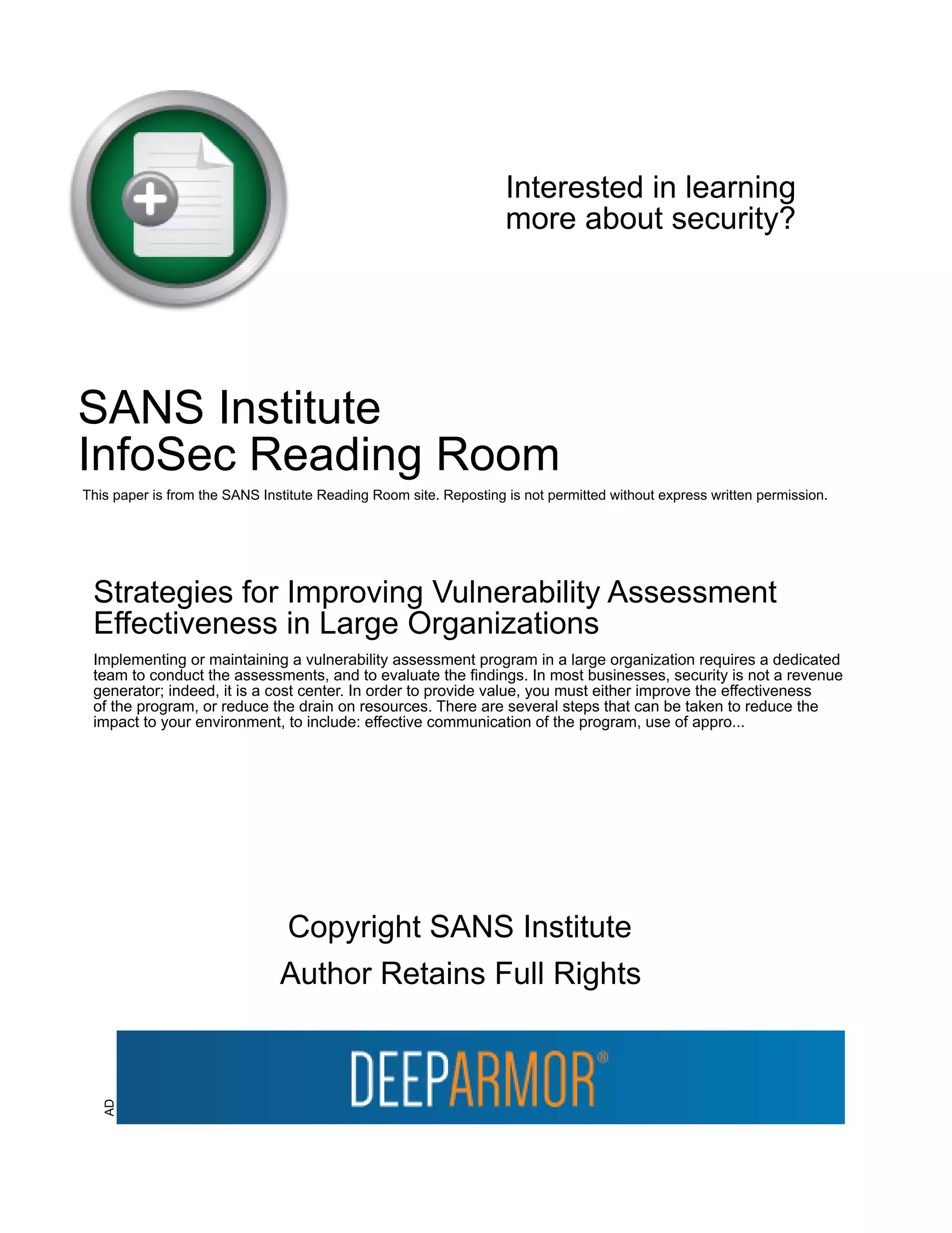 This document discusses strategies for improving the effectiveness of vulnerability assessment programs in large organizations. It recommends improving communication about the program, using change and enterprise management processes, strategically placing network assessment tools, tuning vulnerability assessment policies, and automating assessments. It also discusses managing vulnerability assessment data through remediation, reporting, weighing risks, and verification processes. Finally, it reviews several new tools that take a full lifecycle approach to vulnerability management. Implementing these recommendations and tools can help vulnerability assessment programs provide more value by reducing their impact on resources and demonstrating real risk reduction.