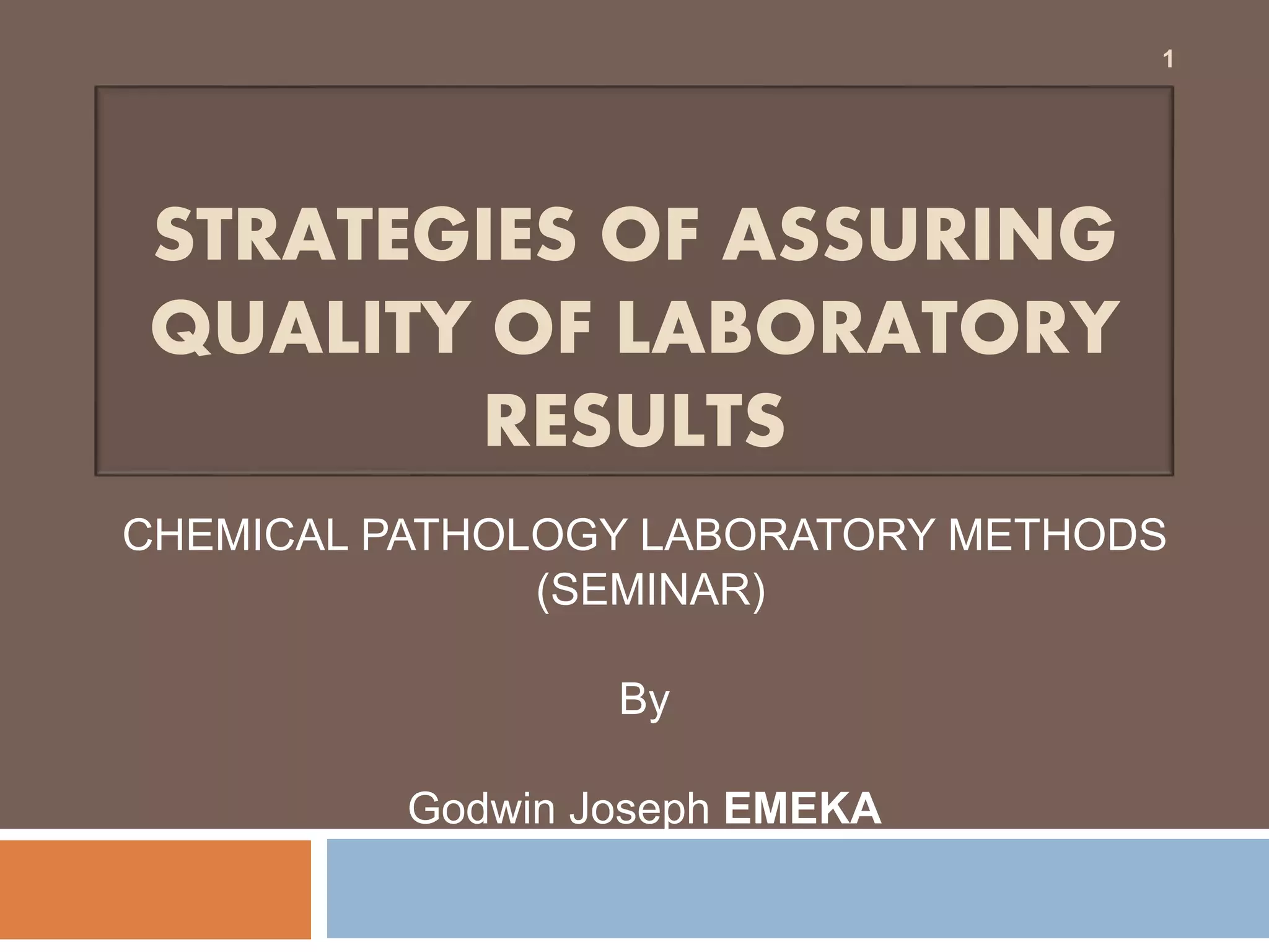 The document discusses strategies for assuring the quality of laboratory results. It covers quality assurance procedures such as quality control, quality assessment, laboratory standardization, and method validation. The key components of quality assurance include quality control, which uses techniques like analysis of reference materials and proficiency testing. Quality assessment involves periodic external evaluation to monitor and improve laboratory performance. Together, effective quality control and assessment help laboratories consistently produce accurate and reliable test results.