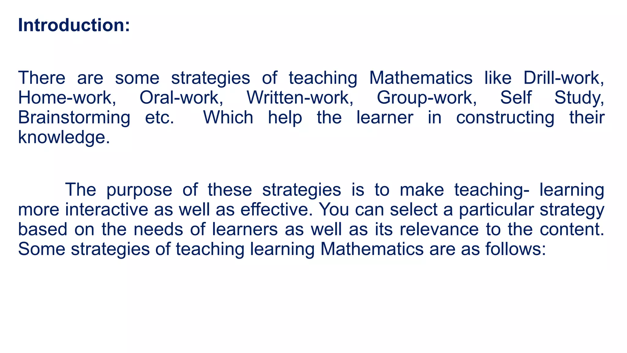 This document discusses several strategies for teaching mathematics, including group work, self-study, supervised study, and brainstorming. Group work involves dividing students into smaller groups based on ability to allow for greater attention. Self-study requires individual learning without help, while supervised study takes place under a teacher's direction. Brainstorming is a method where students freely generate ideas in response to a topic or question. The document provides details on how each strategy can be implemented and their advantages and disadvantages.