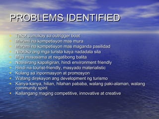 This document outlines strategies proposed by the Puerto Galera Tourism Council to arrest the declining number of tourist arrivals. It identifies problems such as outdated information, lack of tourism-friendly facilities and activities, and environmental damage. The strategies proposed include updating information through an interactive website and tourist center, enhancing attractions like Tamaraw Falls, and upgrading ferry and facility services. Other strategies involve establishing tourism events, regulations for businesses, and reorganizing the Tourism Council.