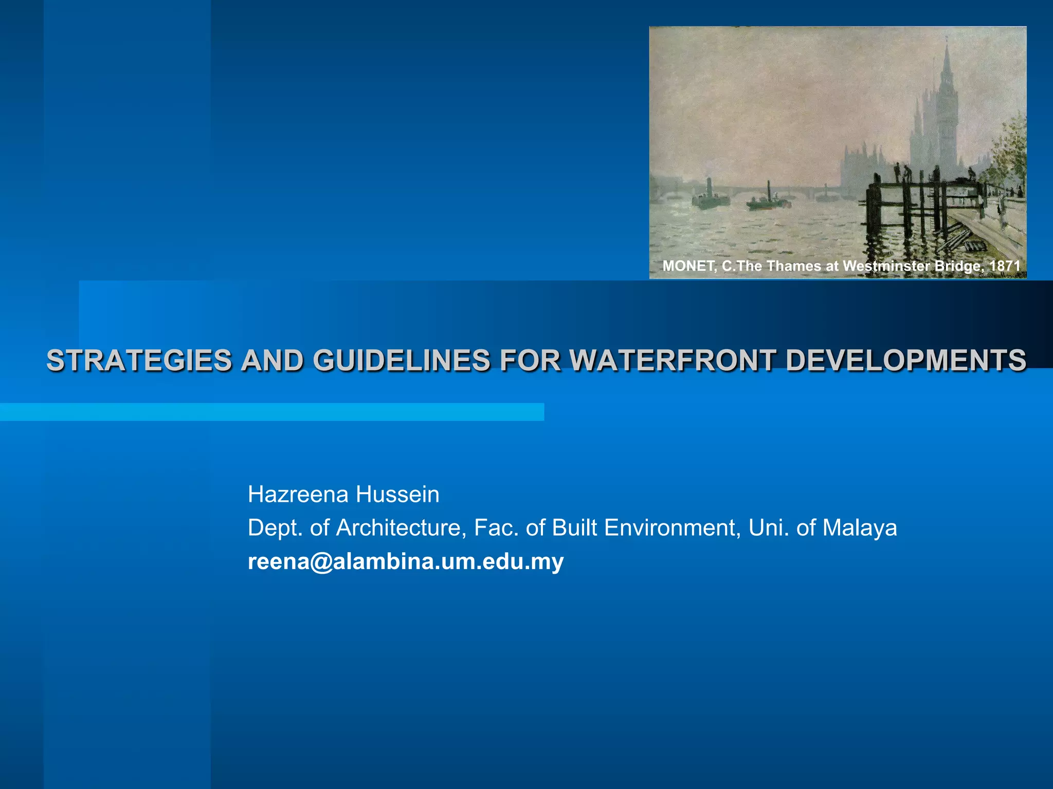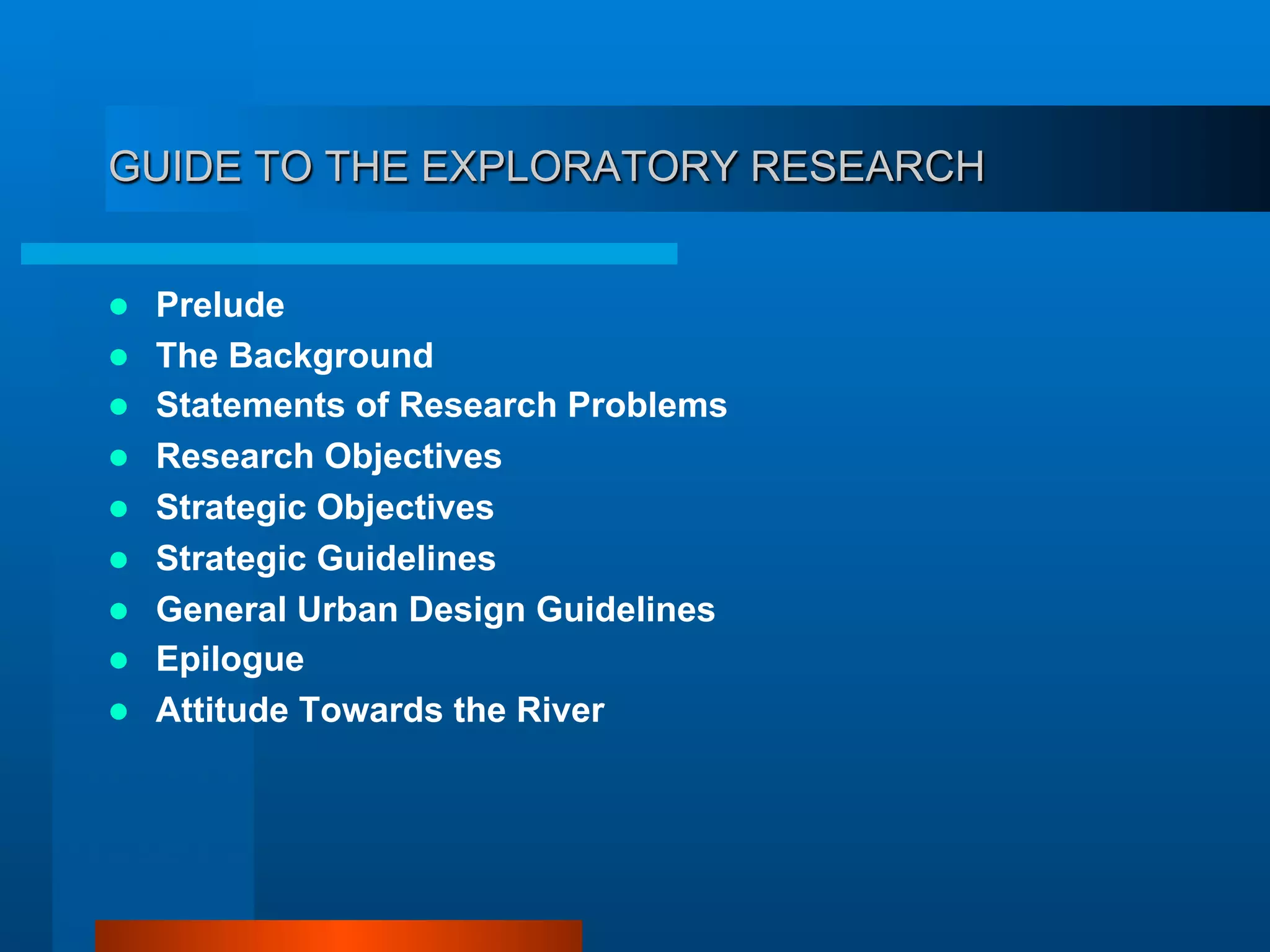 This document outlines strategies and guidelines for waterfront developments. It discusses the background of urban waterfront redevelopments in the 1980s. The research objectives are to produce general strategies and design guidelines for waterfront areas. Some strategic guidelines include ensuring accessibility to the waterfront, maintaining a consistent physical form, enhancing the river as a historical element, and providing recreational river spaces. The document also lists various general urban design guidelines related to topics like site planning, infrastructure, preservation, and development management.