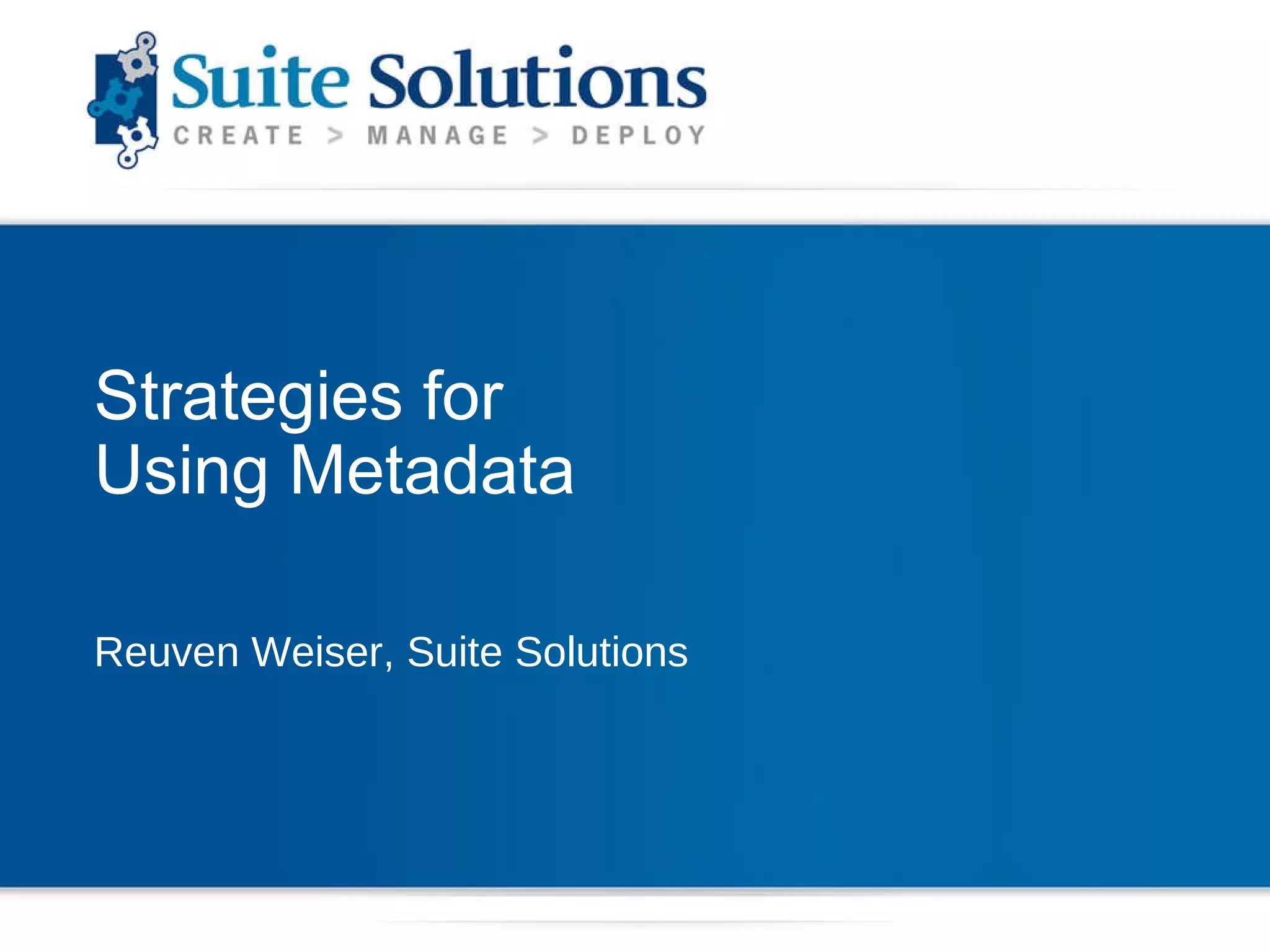 The document discusses strategies for using metadata in DITA content. It defines metadata as "data about data" that provides information about a document or topic. It outlines default metadata options in DITA and bookmap, as well as custom options for adding metadata using techniques like outputclass, <othermeta>, <data>, and specialization. The document provides tips for extracting metadata using XSLT, including using efficient paths and declaring reusable variables.