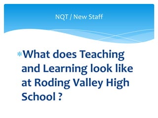 This document provides information for new teachers at Roding Valley High School about teaching and learning. It discusses elements that need to be brought together like assessment for learning, differentiation for learning, zest for learning, and using appropriate home learning and marking. Teachers are encouraged to visit the school's teaching and learning blog and plan outstanding lessons that check understanding, ensure high engagement, develop key skills, and provide helpful feedback to students.