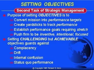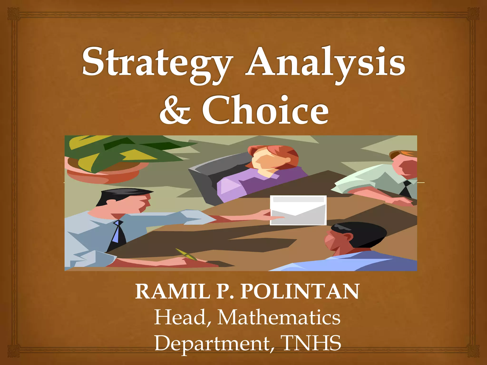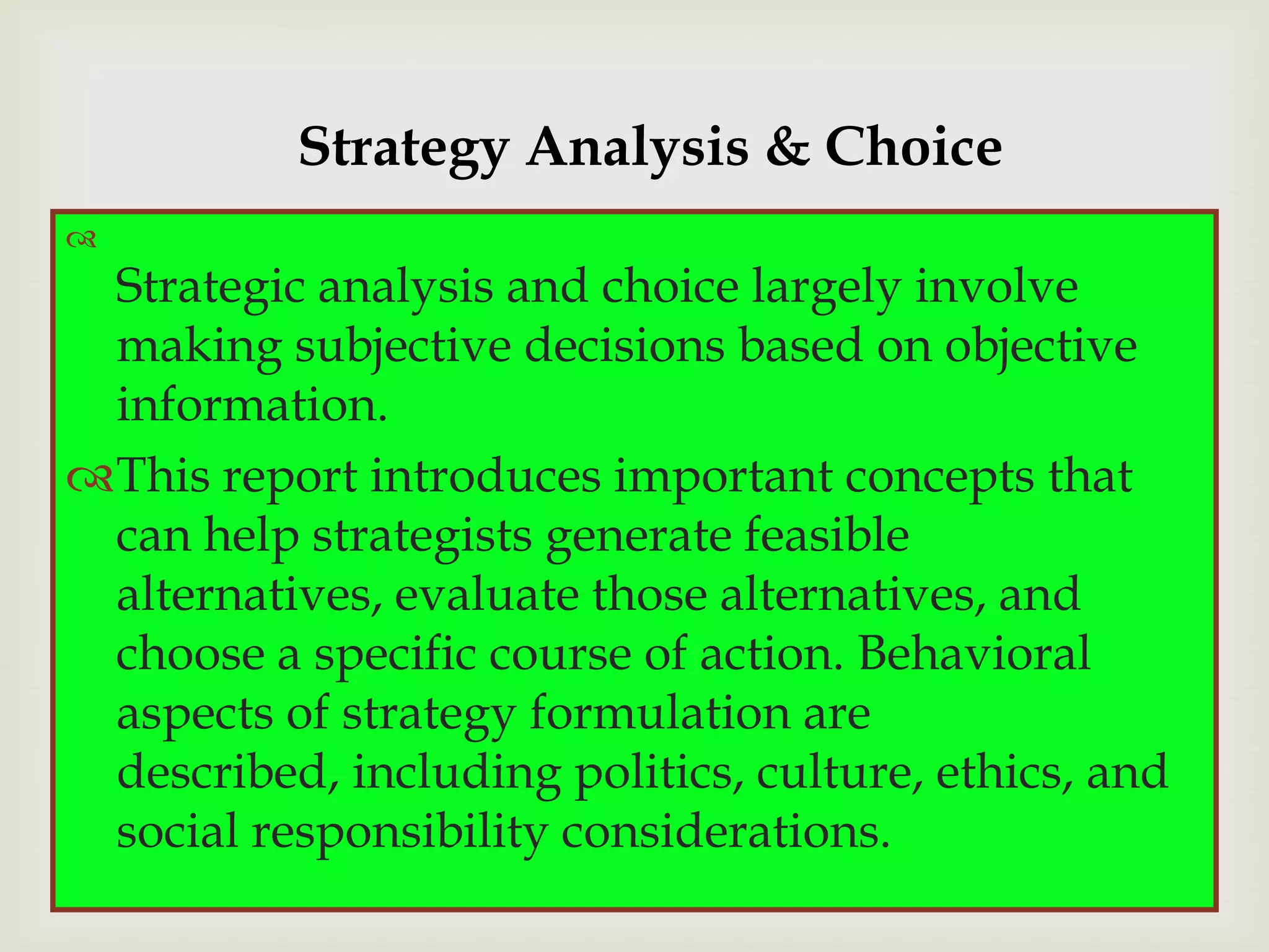 This document discusses strategic analysis and choice frameworks. It introduces concepts to help strategists generate alternatives, evaluate them, and choose a course of action. It describes the nature of strategy analysis and choice, including establishing objectives, generating alternatives, and selecting strategies. Analytical frameworks covered include the internal-external factor matrices, SWOT analysis, BCG matrix, and matching key internal and external factors to formulate alternative strategies. Limitations of the SWOT matrix are also noted. The overall purpose is to provide strategists with tools and concepts to aid in strategic decision making.