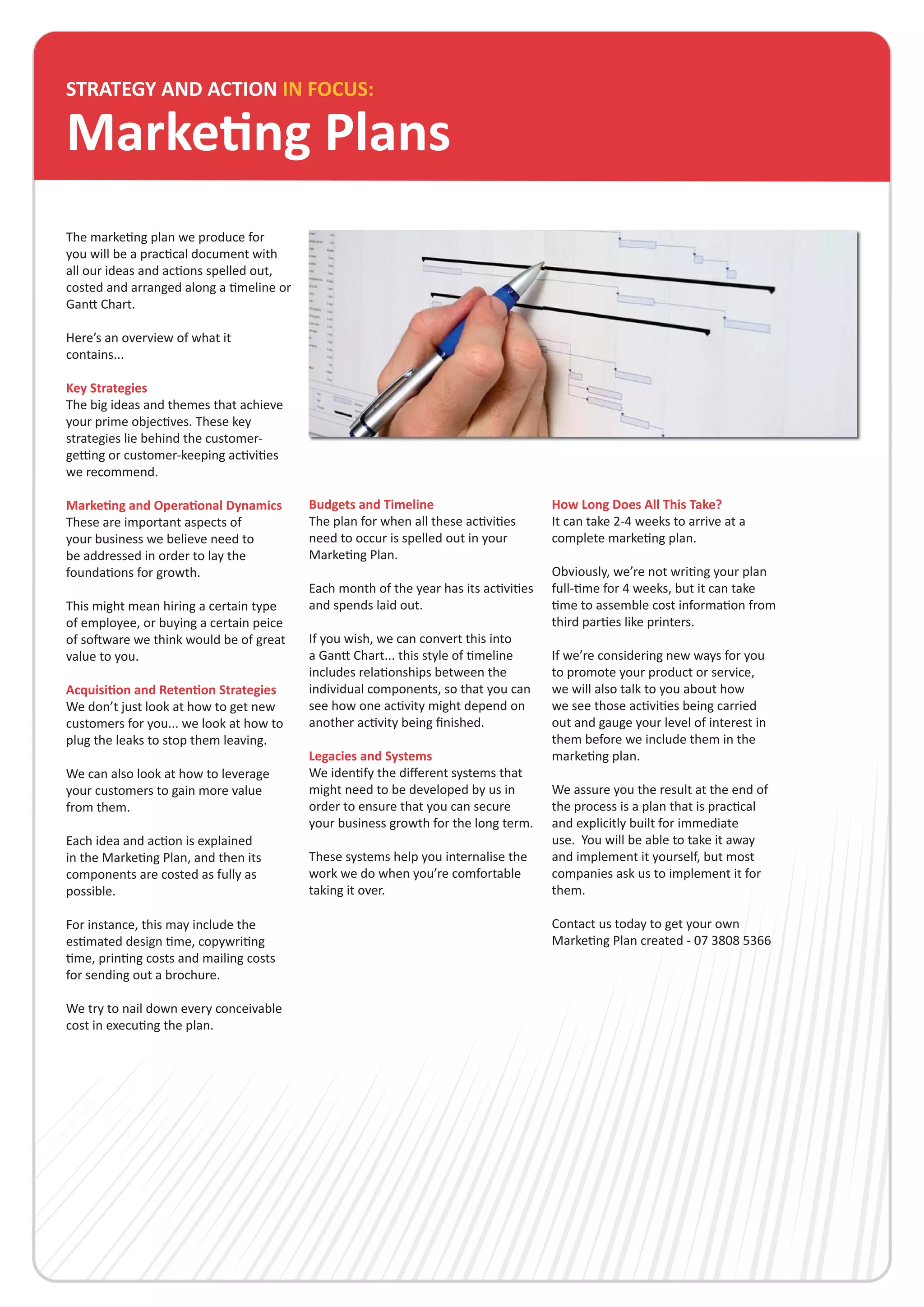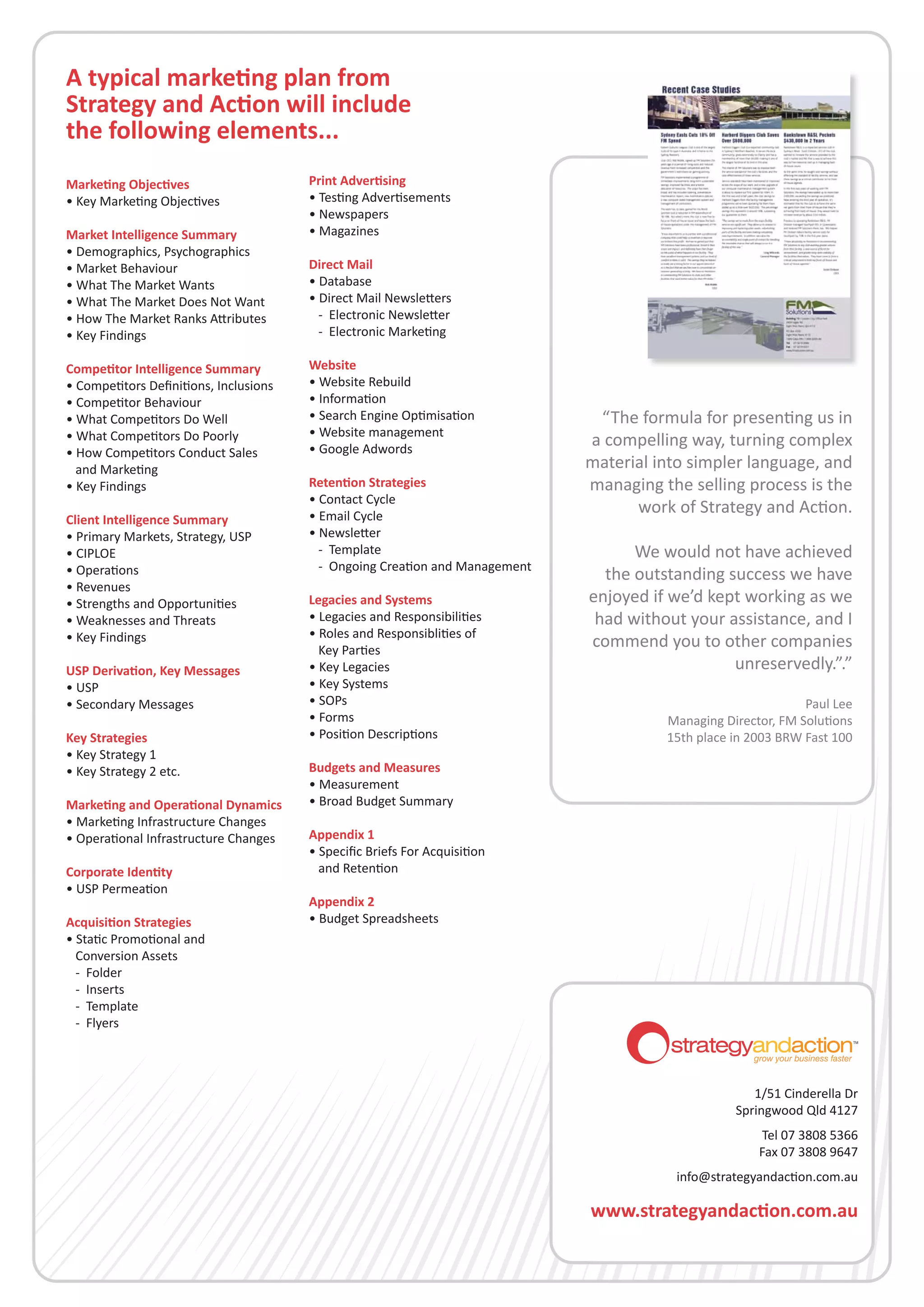 The marketing plan contains key strategies to achieve objectives, budgets and timelines for activities, and recommendations to strengthen operations. It analyzes market and competitor intelligence to derive the client's unique selling proposition and key messages. The plan outlines acquisition and retention strategies with costed tactics across different channels. It also identifies systems needed to implement and track results of the marketing plan.