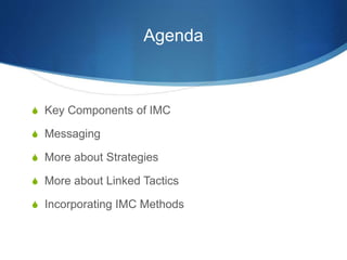 The document discusses strategies for integrated marketing communications (IMC). It defines IMC as coordinating all customer communications to be consistent over time. Key points include: developing messaging, brand, content, promotional and geographical strategies focused on stages of the customer journey; choosing channels based on audience behavior; and creating powerful linked tactics combining traditional and new media with a common message. An example of a successful political IMC campaign in India is provided that linked strategies and tactics across channels to create a landslide victory.