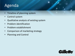 The document summarizes Gillette's planning and control system for its brands from April to January. It then analyzes issues with the existing system and identifies problems with the Right Guard and White Rain brands. Specifically, it notes Right Guard's failure to increase market share despite aggressive advertising maintaining an old image. In contrast, White Rain exceeded expectations with minimal advertising by taking advantage of a competitor's price hike. The document compares marketing strategies between the two brands and details Right Guard and White Rain's individual planning, issues, results, and current status to understand successes and failures.
