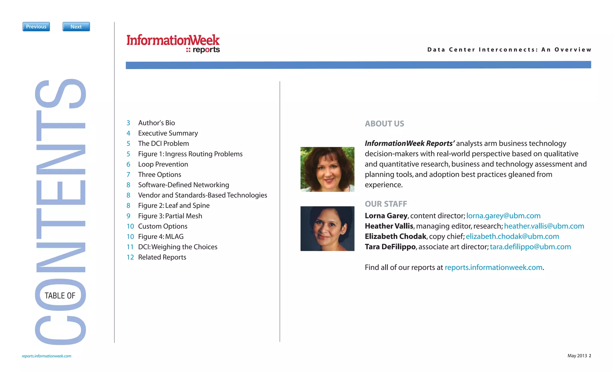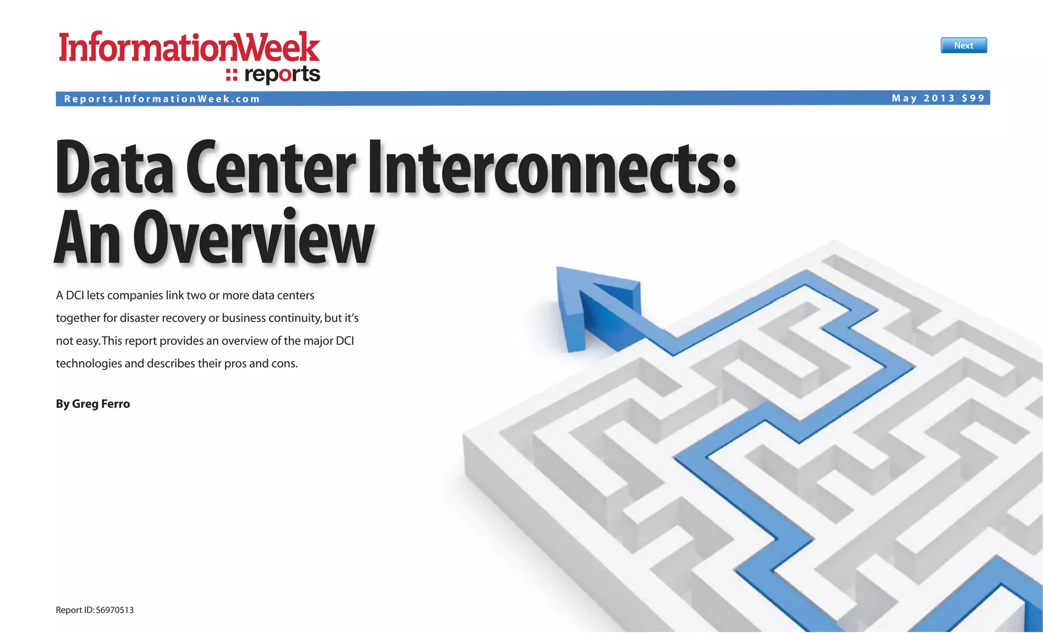 This report discusses Data Center Interconnects (DCIs), which allow organizations to link multiple data centers for disaster recovery and business continuity, focusing on the major DCI technologies and their advantages and disadvantages. It highlights the complexities involved in implementing DCIs due to the limitations of Ethernet technology and explores various options such as dark fiber, MPLS services, and vendor-specific technologies. The report emphasizes the importance of utilizing effective routing and technology solutions to overcome challenges like traffic trombones and server migrations between data centers.